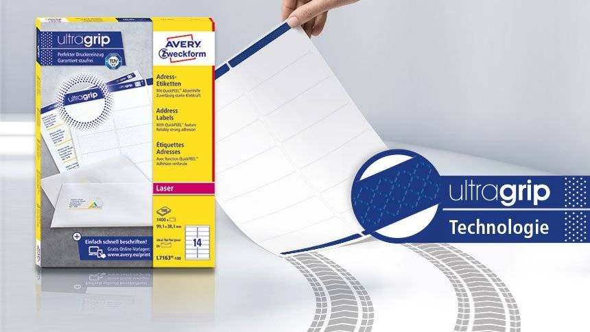 Kaj je ultragrip? Zaradi lažjega in bolj natančnega prehoda lista z etiketami skozi tiskalnik, je na hrbtno stran univerzalnih etiket dodan 3-dimenzionalni odtis, imenovan ultragrip. Odtis ultragrip je na listu jasno viden in ga lahko tudi otipamo. Patentirana tehnologija ultragrip zagotavlja, da mehanizem, ki podaja liste v tiskalnik, deluje zelo natančno.