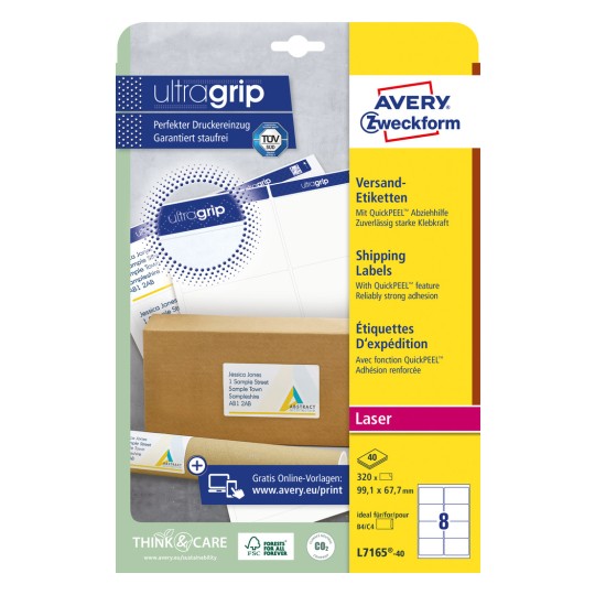 Avery Zweckform bele etikete za naslove L7165-40 so primerne za tiskanje z laserskimi tiskalniki. Velikost etiket je 99.1 x 67.7 mm in so optimirane za ovojnice B4/C4. V zavitku je 320 nalepk oziroma 40 listov.